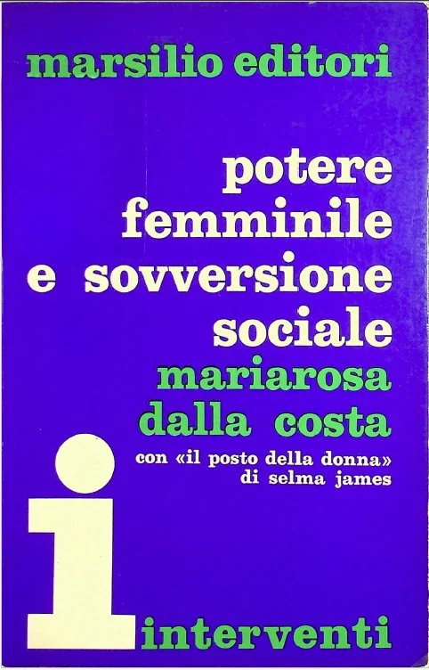The original Italian edition of Potere femminile e sovversione sociale by Mariarosa Dalla Costa, with “Il posto della donna” by Selma James, was published by Marsilio Editori in early 1972. The text is better known in its English language translation, later the same year as “The Power of Women and Subversion of the Community.” Click on the cover image or CLICK HERE to open the document in a new tab.