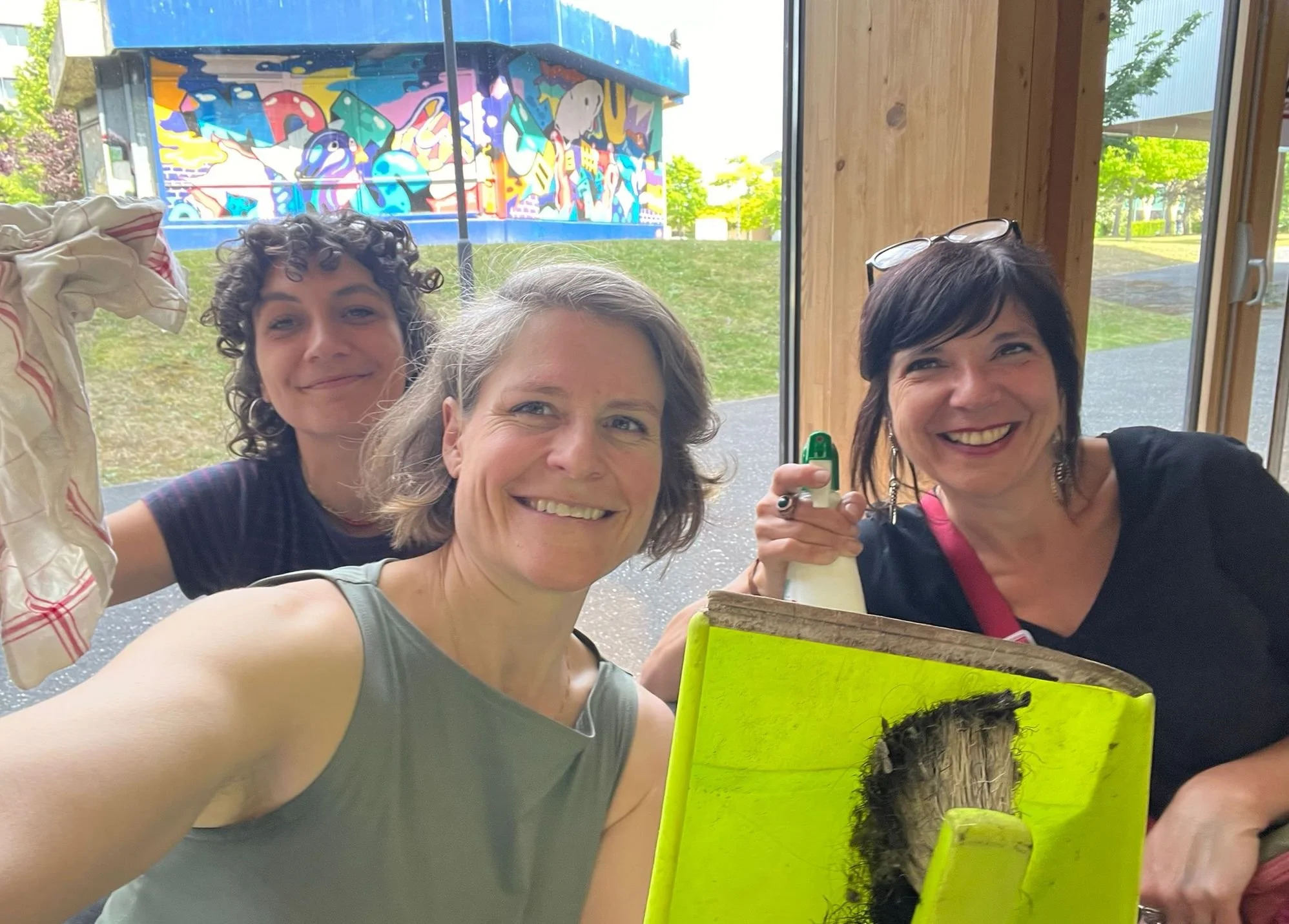 (From left) Noemi Martorano, Barbara Mahlknecht, and Maud Simonet preparing the installation, Université Paris Nanterre, May 21–22, 2025.