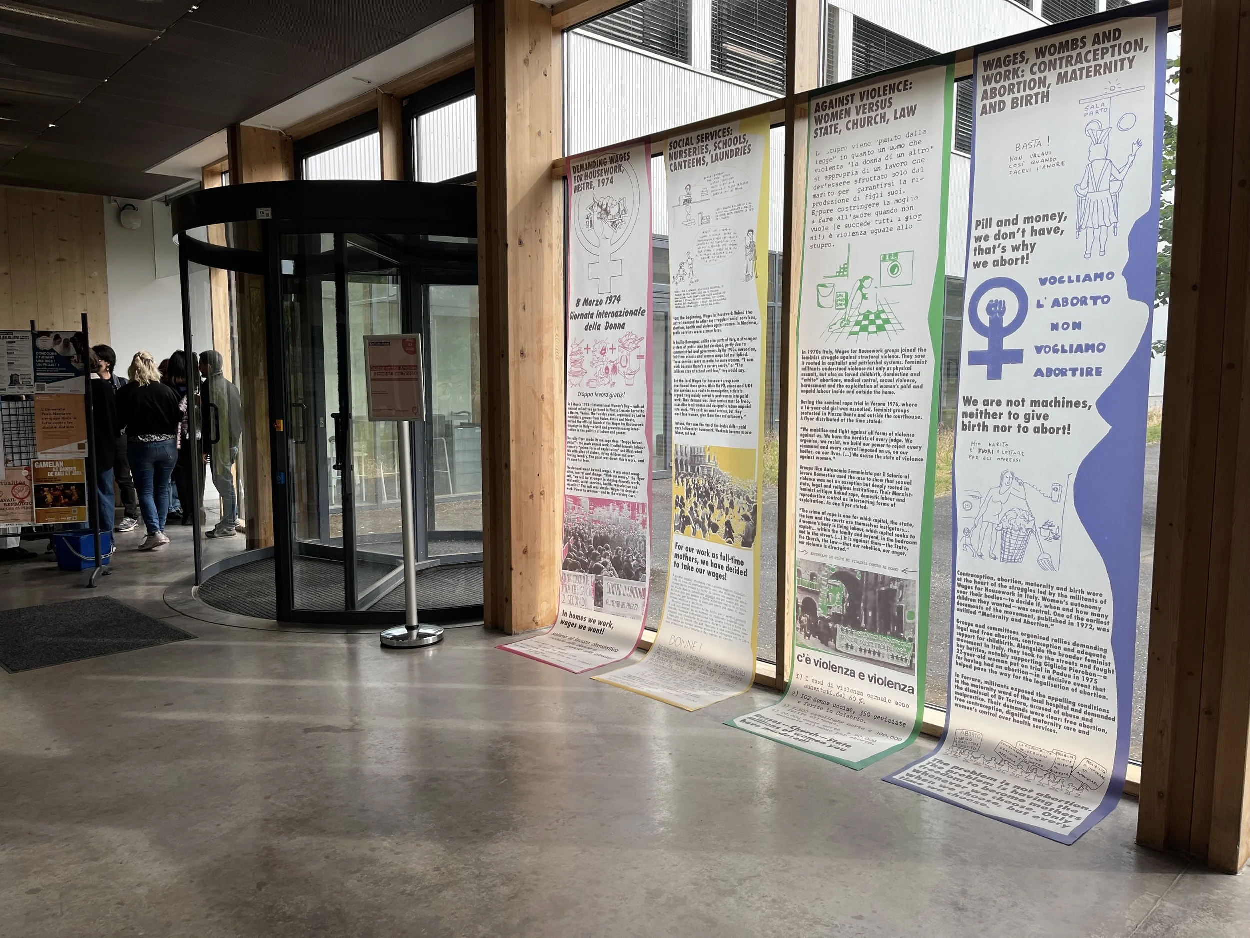 Drawing on materials from the Archive of Feminist Struggles in Padua — including documents from Lotta Femminista donated by Mariarosa Dalla Costa — the installation presents four large banners, with a graphic design by Anna Moschioni, inspired by original pamphlets, leaflets, magazines and photographs. These materials reveal the richness and complexity of feminist organising in 1970s Italy and trace four central strands of the campaign: the demand for the remuneration of housework, the struggle for childcare and social services, resistance to gendered violence and the fight for reproductive rights, contraception, maternity and birth.